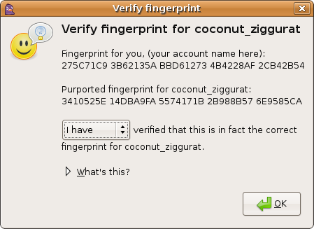However, another common way to authenicate someone is through the use of fingerprints. Roughly speaking, a fingerprint is a long string of 40 letters and numbers that let you identify an OTR user. A typical fingerprint looks something like this: